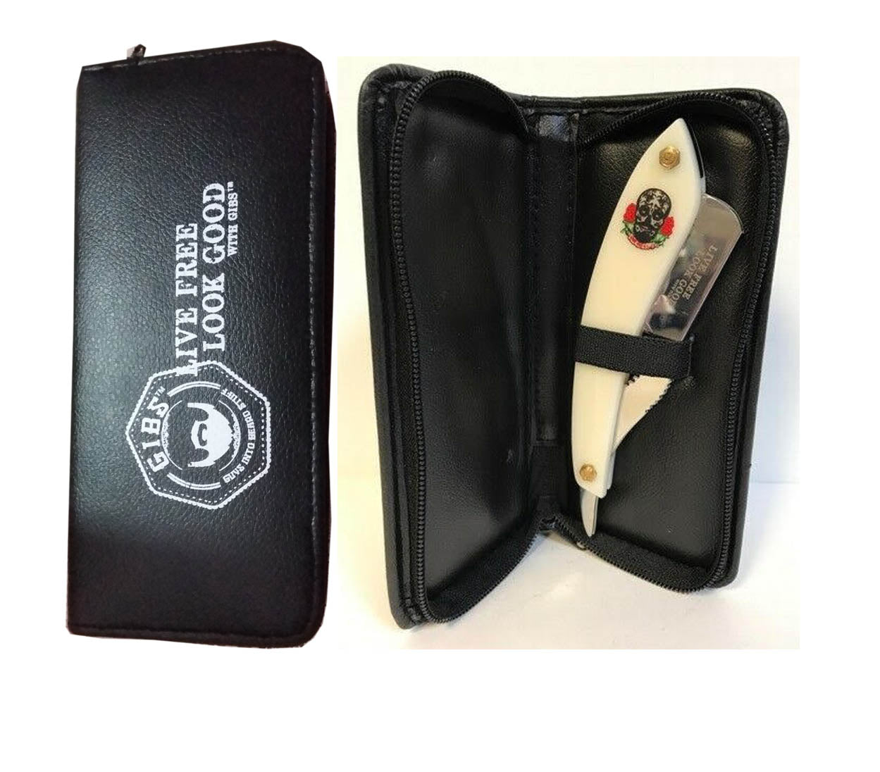 Live Free Razor Set : features a plastic ivory handle with GIBS Sugar Skull logo and a ribbed steel shank.