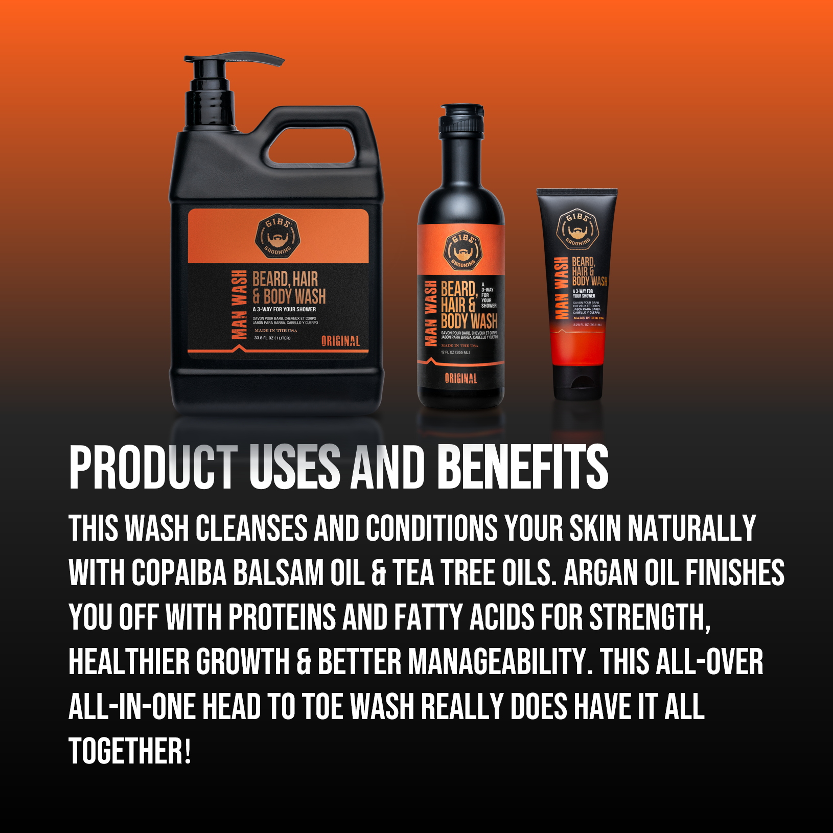 Get the ultimate 3-way with GIBS Man Wash BHB! You’ll instantly experience a rugged, fragrant blend of Citrus, Oak, & Basil using Man wash BHB. This wash also cleanses and conditions your skin naturally with Copaiba Balsam Oil & Tea Tree Oils. Don’t stop there! Hemp Oil & Argan Oil finish you off with Proteins and Fatty Acids for strength, healthier growth, & better manageability. This all-over, all-in-one, head-to-toe wash really does have it all together!