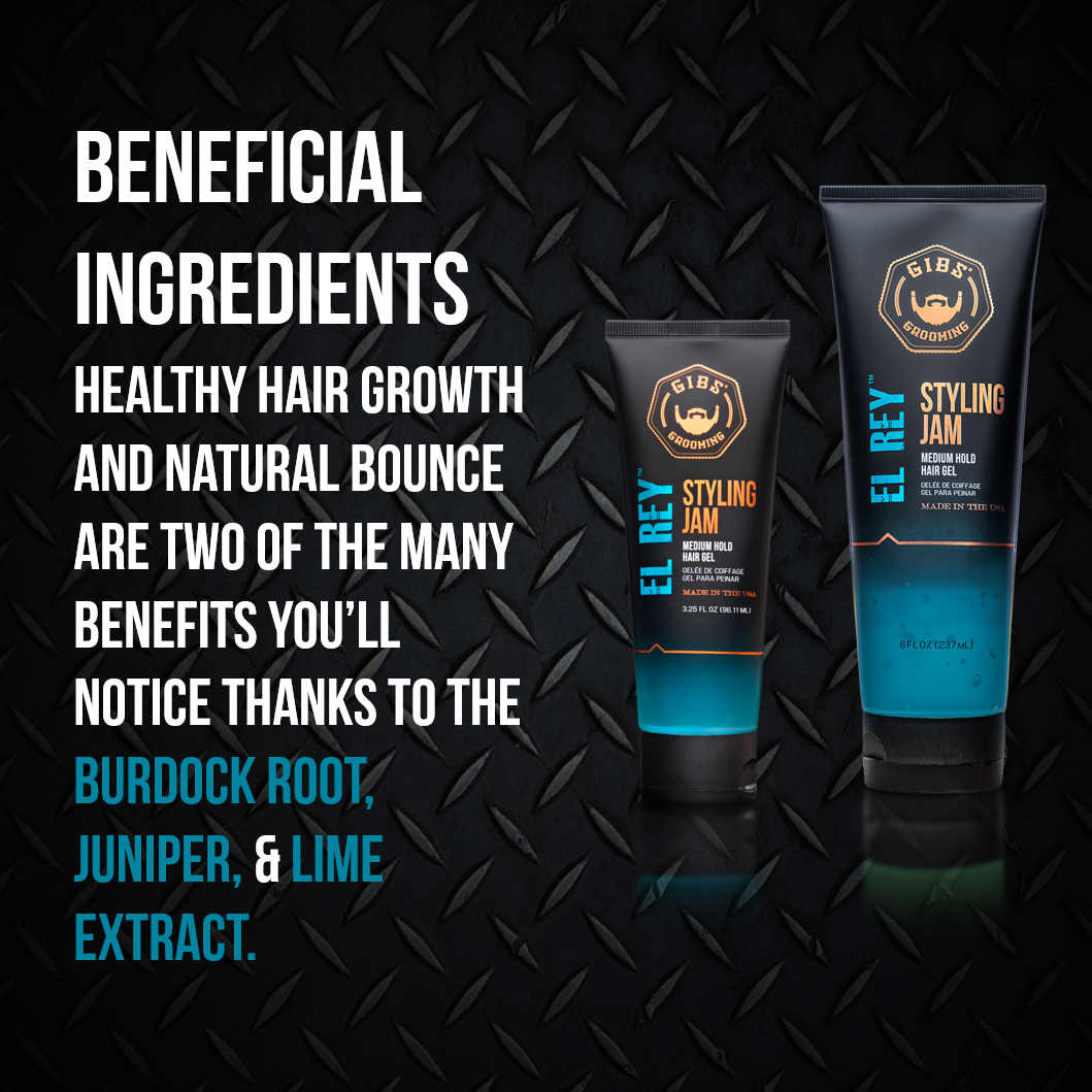 Healthy hair growth and natural bounce are two of the many benefits you’ll notice thanks to the Burdock Root, Juniper & Lime Extract found in GIBS El Rey styling gel! Add a bit of GIBS styling jam to hair, style to desired look and enjoy fragrant hints of nutmeg, leather, and musk that are sure to take you back to those ol’ time barber shop days of our past!